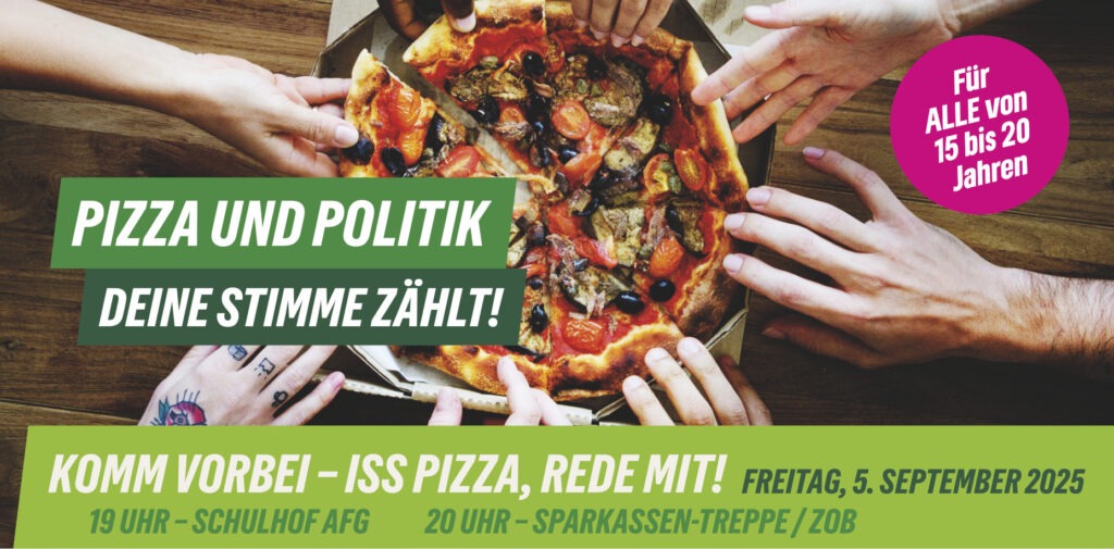 Komm vorbei zu „Pizza & Politik“ – deinem Treff für echte Gespräche und ehrliche Infos zur Wahl und alle Themen, die dich interessieren. Natürlich mit kosten-loser Pizza!