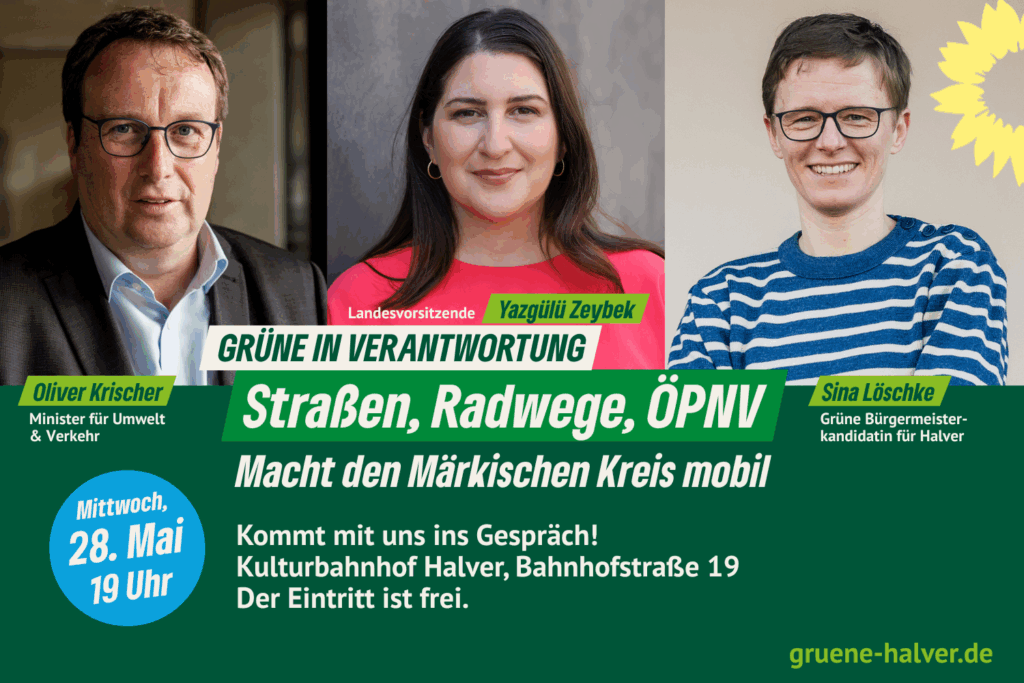 Wie die Mobilität im südlichen Märkischen Kreis langfristig gesichert und die Verkehrswende auch im ländlichen Raum gelingen kann, darüber diskutieren am Mittwoch, den 28. Mai, Oliver Krischer, grüner Landesminister für Umwelt und Verkehr, Yazgülü Zeybek, Landesvorsitzende der GRÜNEN NRW und Sina Löschke, grüne Bürgermeisterkandidatin für Halver im Rahmen der Veranstaltungsreihe “Grüne in Verantwortung” gemeinsam mit Bürgerinnen und Bürgern in Halver.